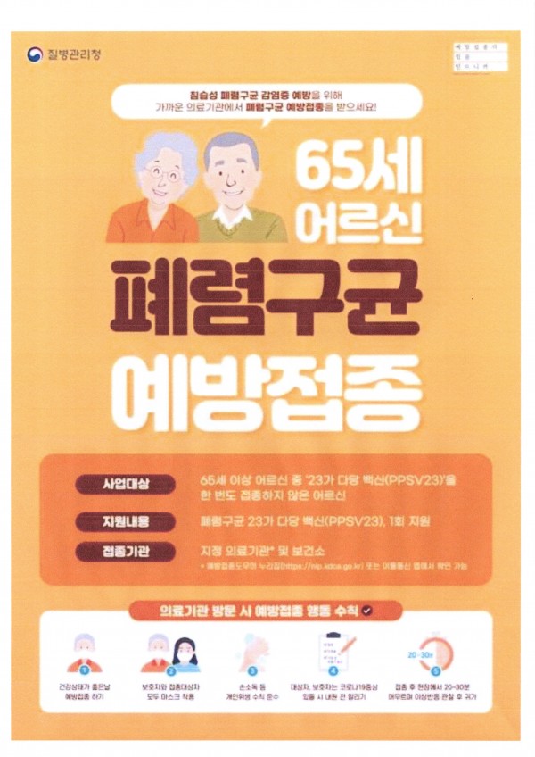 65세 이상 어르신 폐렴접종 안내 페이지 정보 작성자 고운통증의학과 작성일25-05-16 16:54 조회1,286회 댓글0건 이전글 다음글 목록 본문 65세 이상 어르신 무료 폐렴구균 접종이 가능합니다. (1회 지원) 댓글목록 등록된 댓글이 없습니다. 이전글 다음글 목록