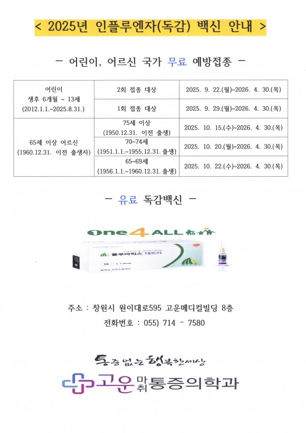 2025년 독감 접종 안내 페이지 정보 작성자 고운통증의학과 작성일25-09-20 11:16 조회1,157회 댓글0건 이전글 다음글 목록 본문 2025년 독감 접종을 시작합니다. -통증없는 세상을 꿈꿉니다- 댓글목록 등록된 댓글이 없습니다. 이전글 다음글 목록